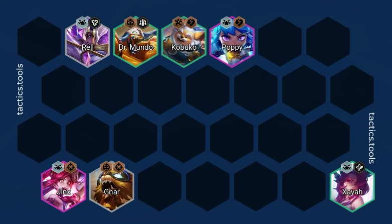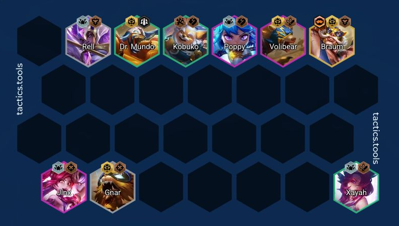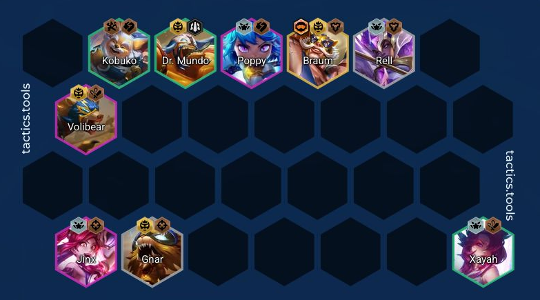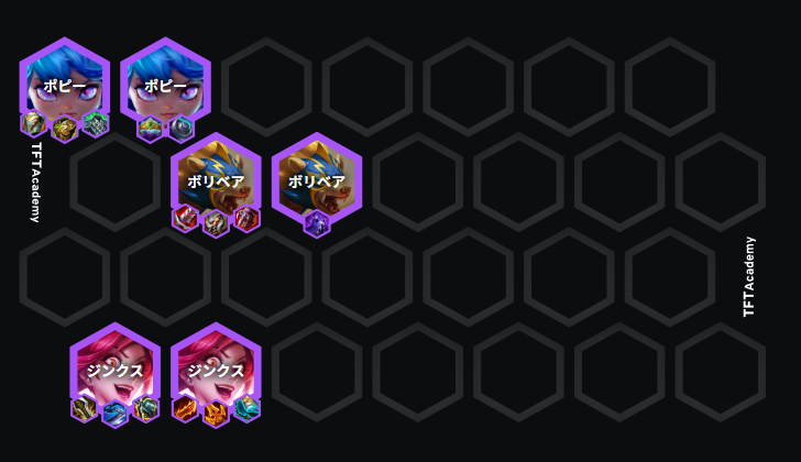 バフの入ったボリベアを入れて前パッチから強かったスターガーディアンの4コストのジンクスとポッピーを入れてキャリーしていく構成になります。