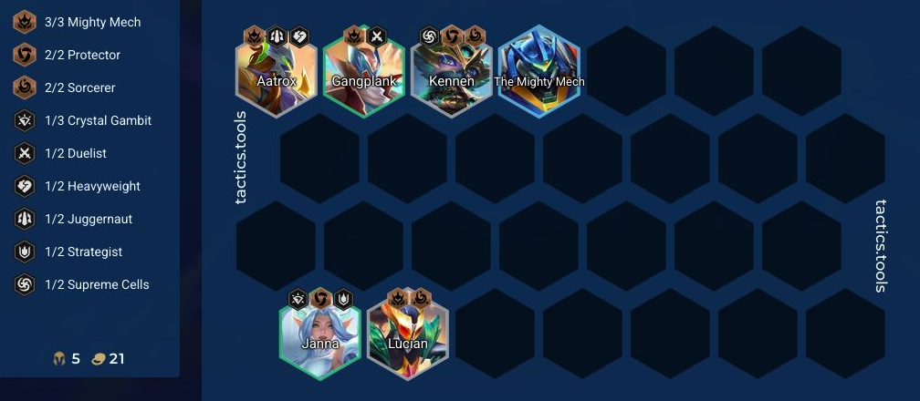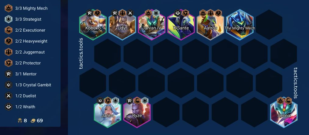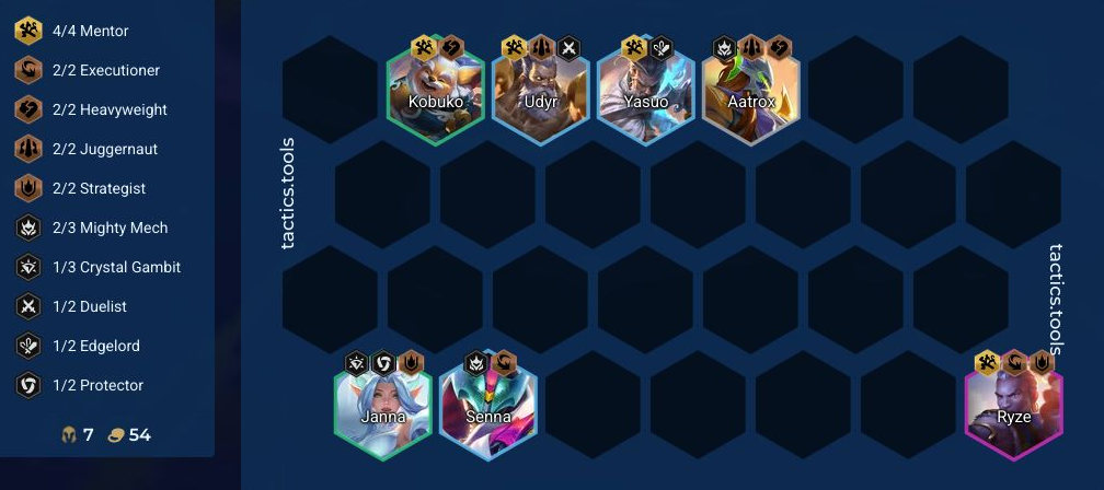 猛者を付けたジャンナのメンター4は中々の破壊力があるので、今パッチの2コストリロール構成では一番強い構成です。コブコは他のヘビーウエイトの構成でも使われるので、他のプレイヤーが使っていて☆3が難しそうな場合は☆2で止めてレベル8に行くことも大切な場面があります。