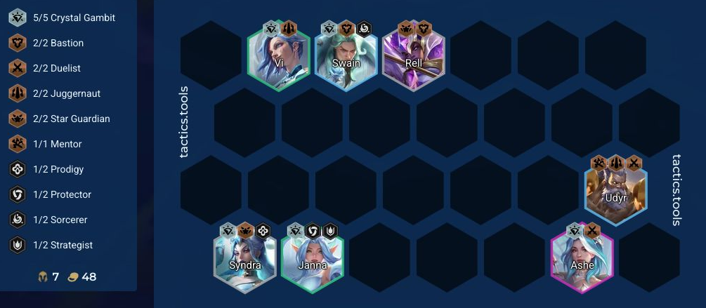 序盤負け進行でクリスタルガンビットのジェムパワーを貯めて後半に巻き返していく、もしくは、序盤に別の構成を使いながらクリスタルガンビット5を目指していき特定キル数での報酬を獲得していく動きがクリスタルガンビット構成になります。