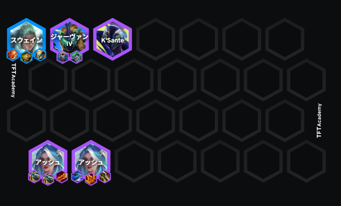 4ステージ目は4-2でレベルを上げて8レベルでリロールをしていきます。4コストを狙って重ねていき、ザイラを引けた場合はシンドラと入れ替えします。アッシュと重なった前衛の駒にアイテムを載せて4ステージの勝ちを狙っていきゴールドを貯めていきます。