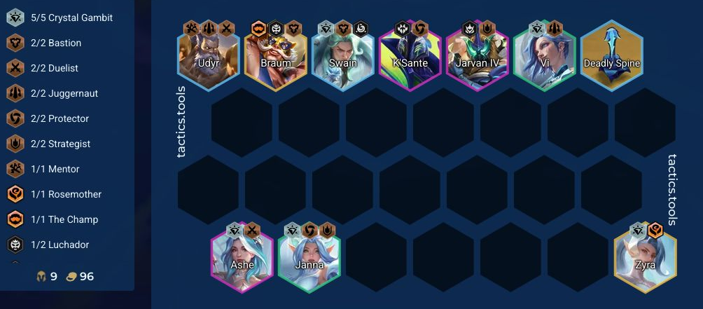 5ステージ目は貯めたゴールドを使い9レベルにレベルを上げてブラウムを入れて前衛を厚くしていきます。盤面に駒を☆2にした後はゴールドを貯めてレベル10を目指していき、10レベルの時にはリー・シンをデュエリストもしくはジャガーノートで盤面に入れます。