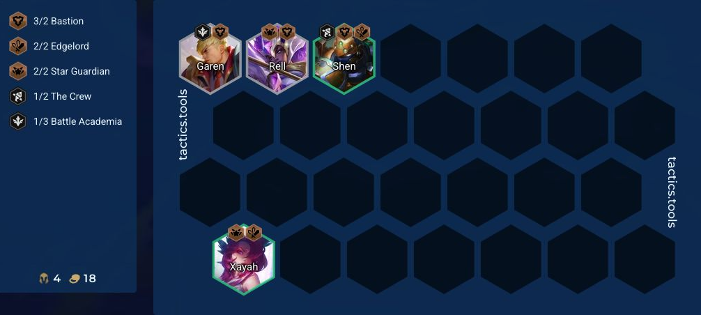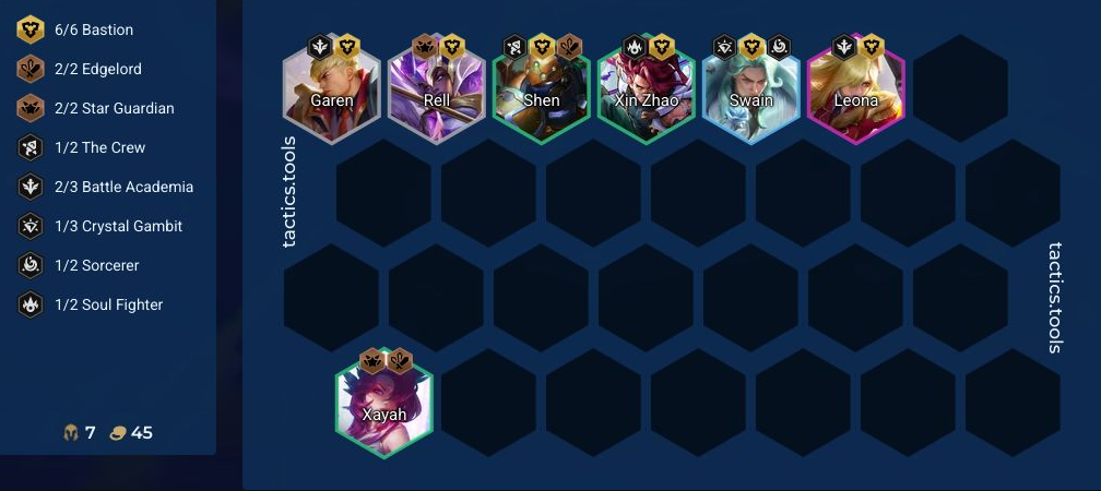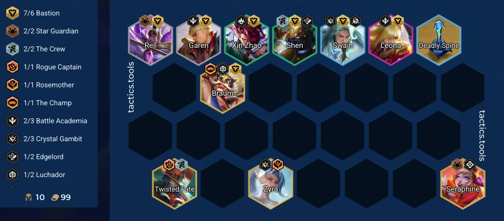 最終形は上の画像のような形になります。前衛にバスティオンの駒を配置して、5コストの駒を配置していく構成になります。ブラウムを引けてバスティオンの駒が7体になった時にはガレンを抜いて5コストの駒を入れるのが良いです。