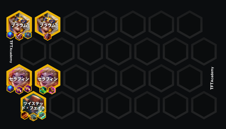 2ステージ目は2-1でレベルを上げて上のような画像の盤面を作ります。ザヤはツイステッドフェイトのアイテムを持たせることができます。ザヤの代わりにシンドラもおすすめです。