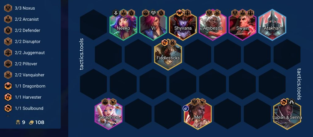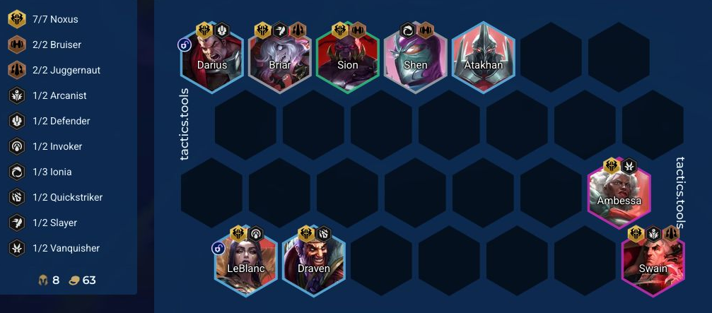 アンベッサやスウェインを手に入れた時にはノクサスを伸ばしてノクサス7を発動するか、ヴァイやニーコを盤面に出して、他の特性を出すようにしていきましょう。